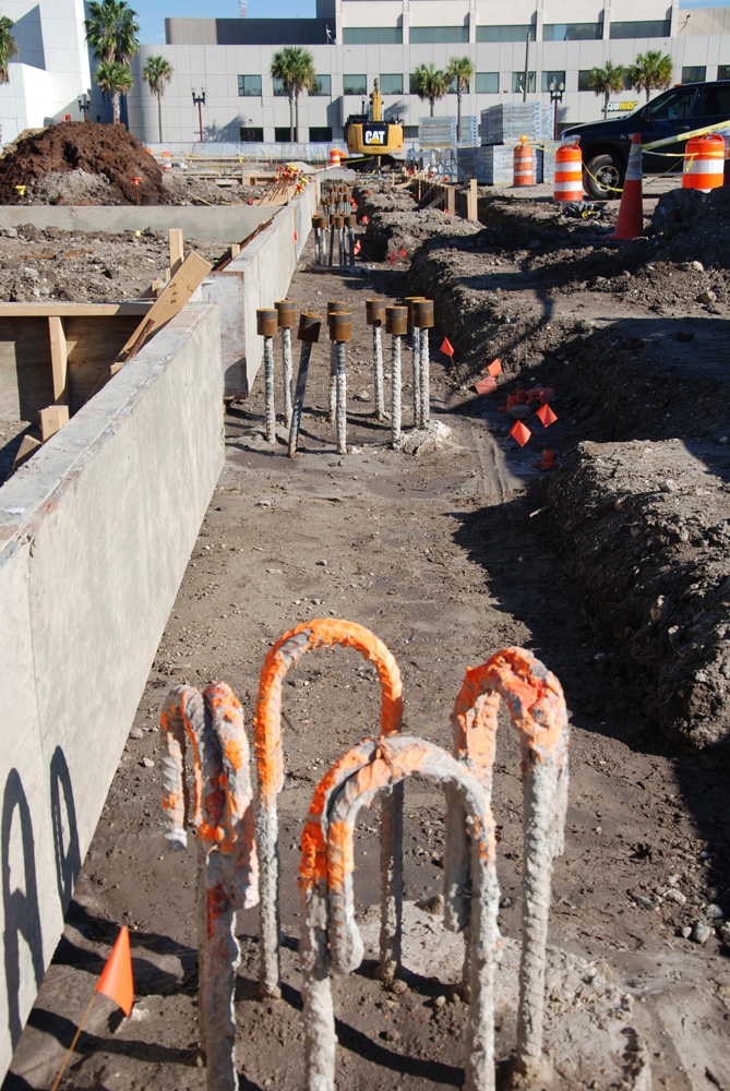 Description: The choice was made to run the bars long on all the drilled shaft cages instead of hooks.  Once the cages were set the bars were cut to the correct elevation and the HeadLocks were used to anchor the cages for sizes #11, #14, and #18.  The contractor commented that without the hooks they did not have to worry about elevation issues and it was so much easier to pour the concrete with a lot of room for the tremie.